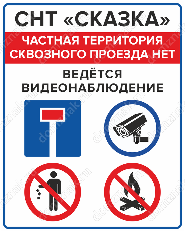 Табличка «Частная территория сквозного проезда нет. Ведется видеонаблюдение.» изготавливается на основе из пластика ПВХ или оцинкованного металла.