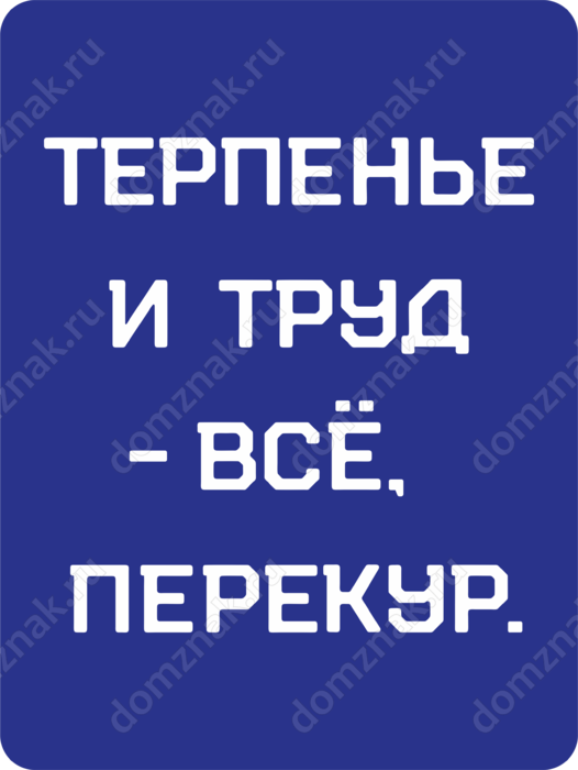 Табличка «Терпенье и труд - все, перекур» изготовлена из пластика ПВХ, толщиной 4 мм. Изображение наносится по технологии УФ-печати. Табличка предназначена для использования как в помещении, так и на улице.