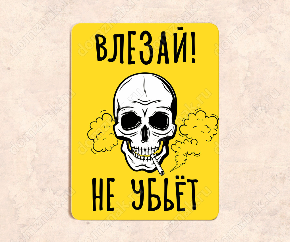 Табличка «Влезай! не убьёт!» изготовлена из пластика ПВХ, толщиной 4 мм. Изображение наносится по технологии УФ-печати. Табличка предназначена для использования как в помещении, так и на улице.