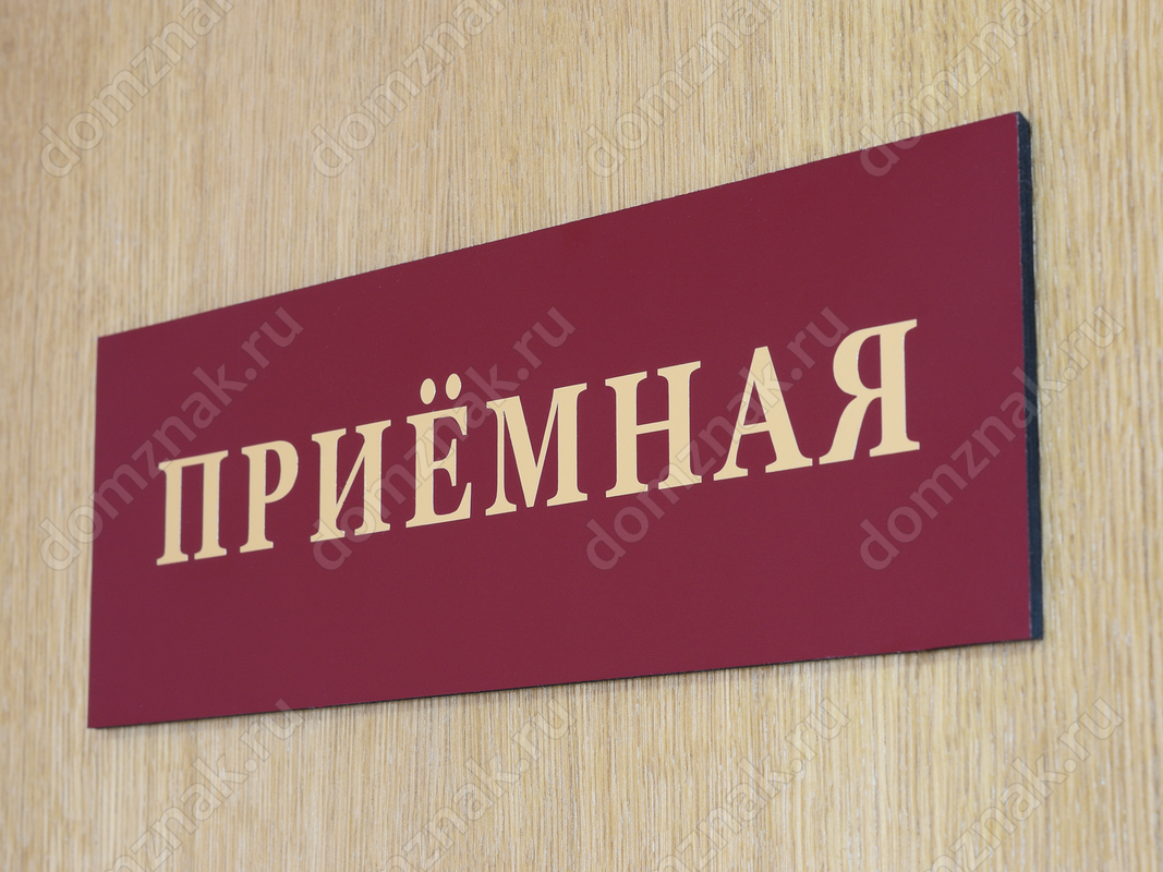 Табличка на дверь «Приёмная» изготавливается из фактурного пластика с зеркальной поверхностью «под серебро» или «под золото». Надписи наносятся методом аппликации матовой самоклеящейся плёнкой.
